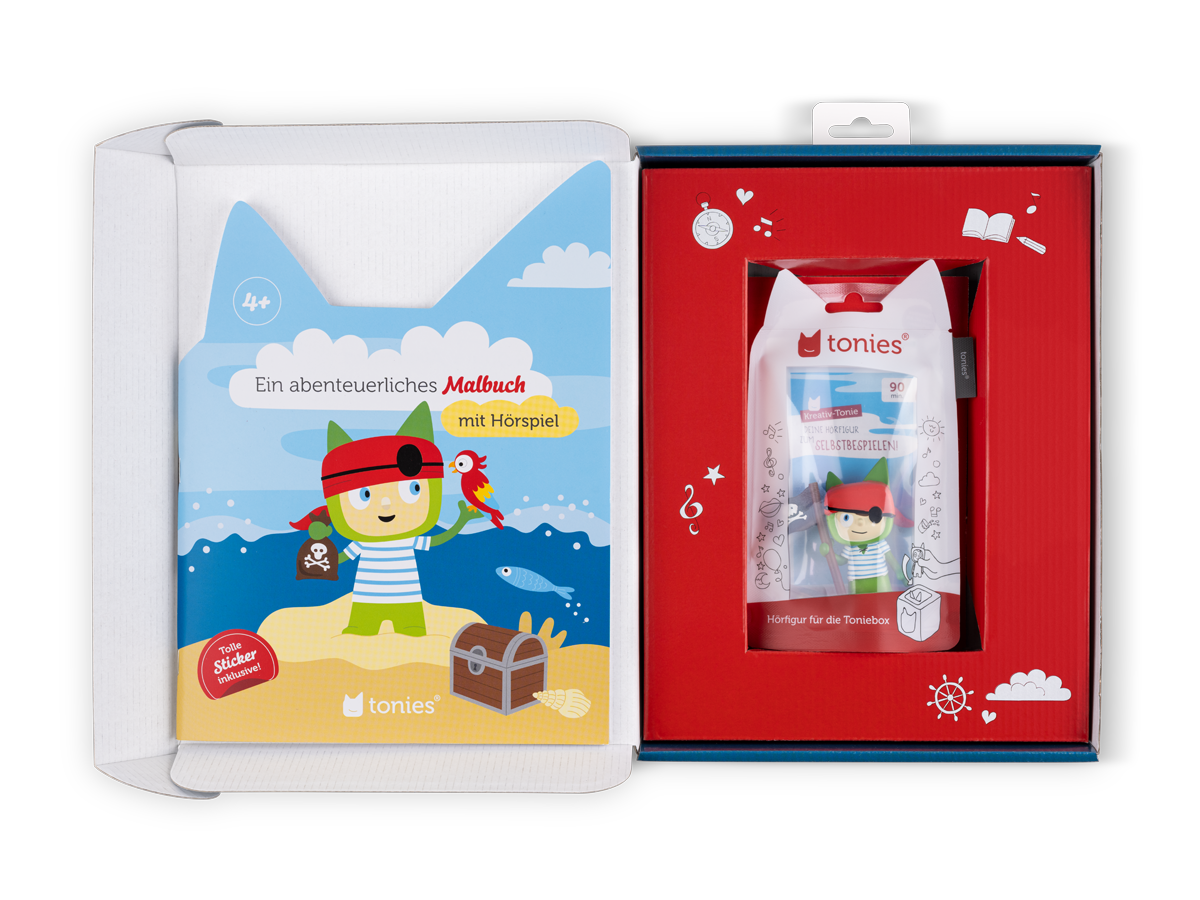 Lausche dem Hörspiel des Kreativ-Tonies auf deiner Toniebox und verfolge die Geschichte gleichzeitig in dem passendem Malbuch. Hüpfe mit dem Piraten von Kapitel zu Kapitel und Seite zu Seite. Mit Farben und Fantasie erweckst du die Geschichte so zum Leben - in deinem Kopf und auf dem Papier. Werde Teil der Geschichte Deine Fantasie füllt die magische tonies® Welt im Malbuch mit Farbe. So wird dein Buntstift zum Zauberstab. Im magischen Malbuch findest du einen QR-Code für das Hörspiel “Der kleine Pirat und die Spur der Schätze”, das dein Malbuch begleitet. Ein Kreativ-Tonie auf der Toniebox erzählt dir die Geschichte vom kleinen Piraten und nimmt dich mit auf große Abenteuer. Der kleine Pirat und die Spur der Schätze Das kleine Piratenschiff quillt aus allen Nähten vor lauter Gold, Diamanten und anderen Schätzen. Also beschließen der kleine Pirat und seine beste Freundin, der Papagei, all ihre Tonies-Freunde zu besuchen und die Schätze zu verteilen. Ein großes Abenteuer!